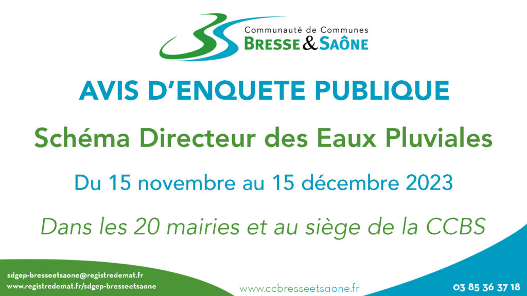 La Communauté de Communes Bresse et Saône a arrêté les dates de l’enquête publique du schéma directeur des eaux pluviales par arrêté en date du 2 octobre 2023.