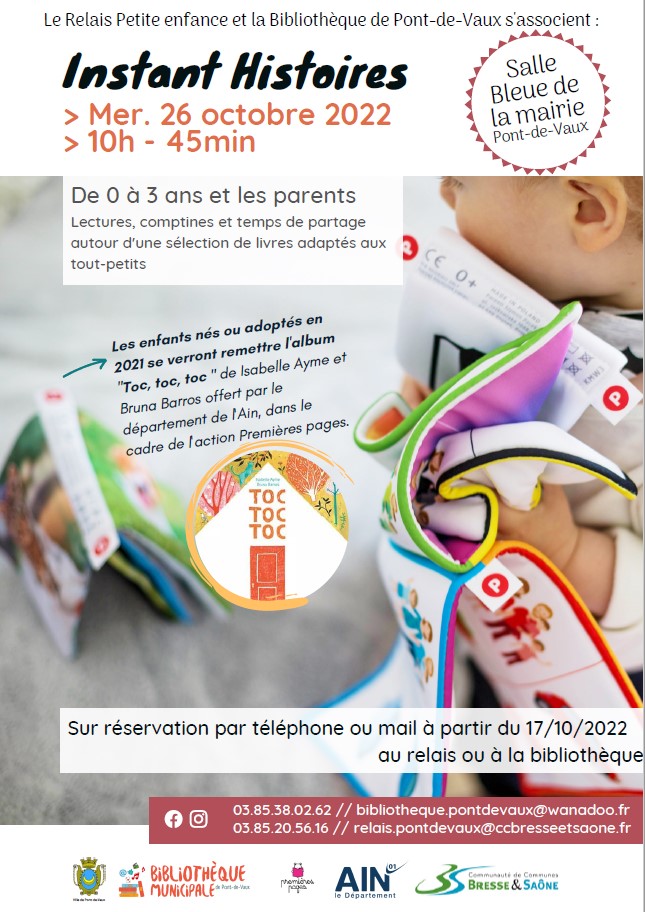 Pour les parents d’enfants de 0 à 3 ans, un temps de lecture ainsi qu’une remise de l’album « Toc, toc, toc » (né en 2021) vous sont proposés par la Bibliothèque Municipale de Pont-de-Vaux et le Relais Petite Enfance « Les Moussaillons ».
