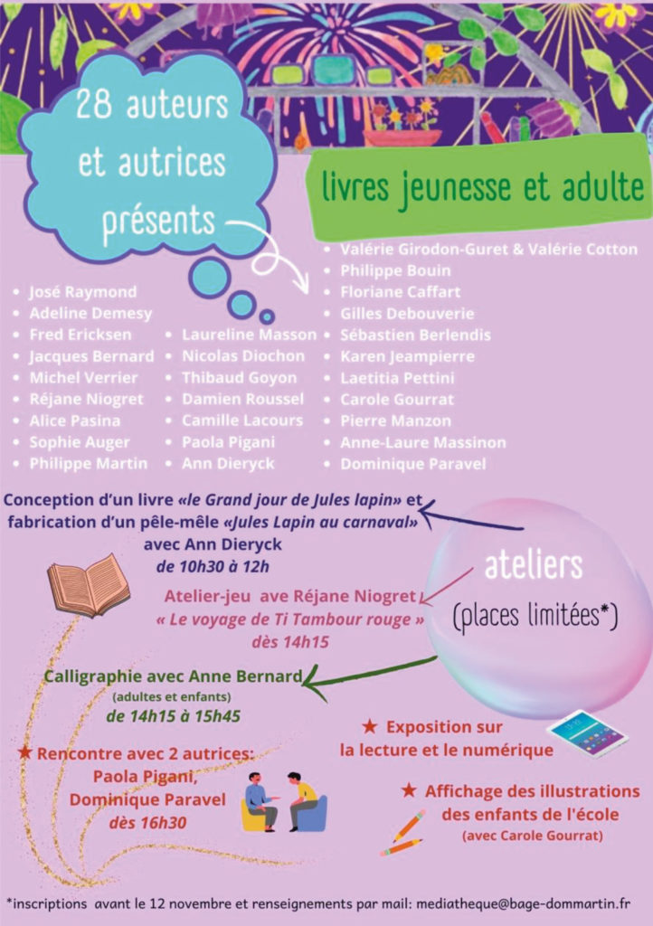 Rendez-vous à la salle des fêtes de Bâgé-la-Ville de 10h à 12h15 et de 13h45 à 18h avec la présence de 28 auteurs et autrices ! Retrouvez ci-dessous le programme avec des ateliers, des jeux et des rencontres :