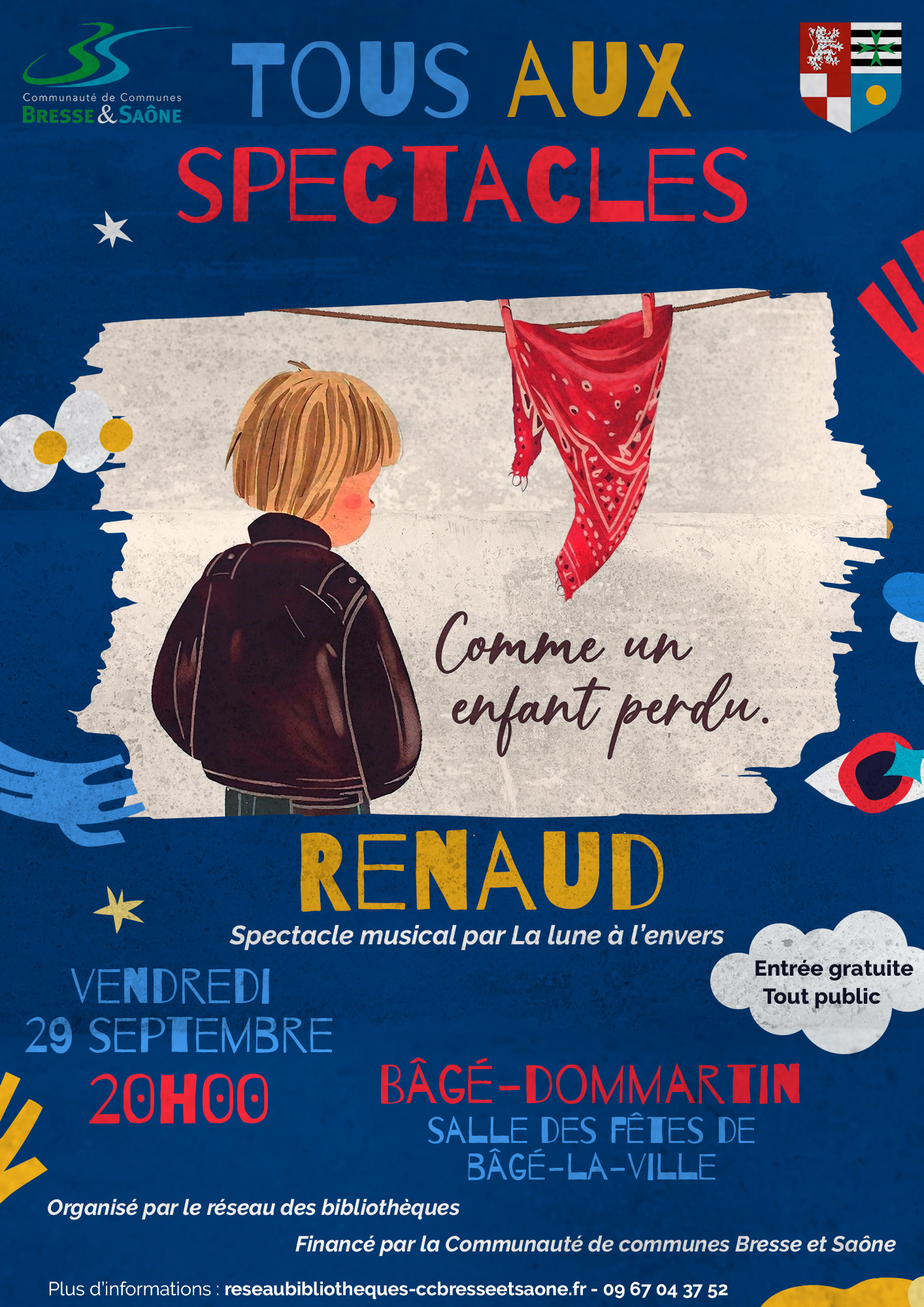 La bibliothèque de Bâgé-Dommartin reçoit la La lune à l’envers dans la salle des fêtes de Bâgé-la-Ville qui jouera son spectacle musical « Renaud » le vendredi 29 septembre à 20h00.