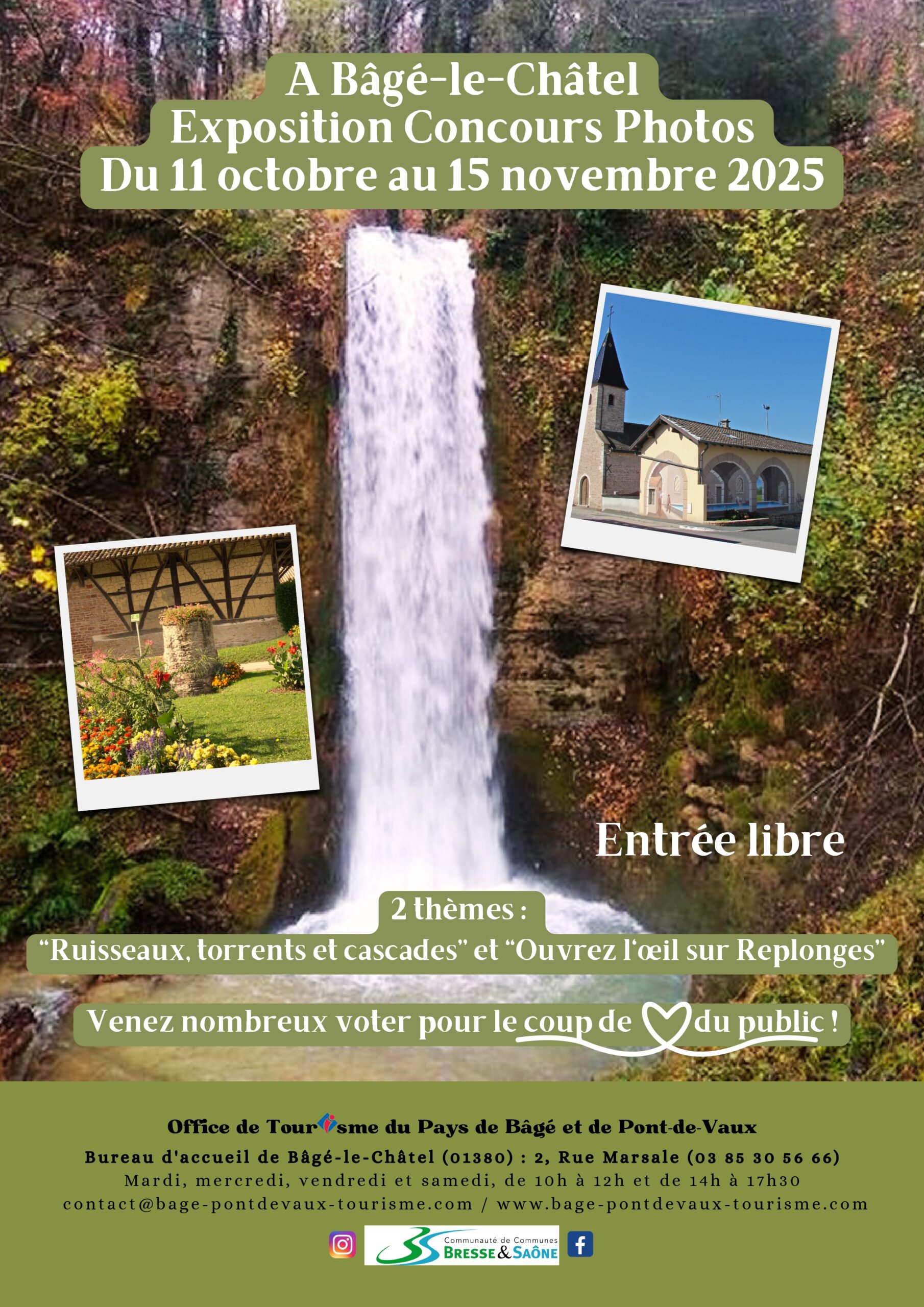 Accueil>Bâgé-le-Châtel | Exposition du concours photos Bâgé-le-Châtel | Exposition du concours photos 11 Oct - 15 Nov. L’Office de tourisme du Pays de Bâgé et de Pont-de-Vaux organise une exposition concours photos du 11 octobre au 15 novembre 2025 ! Hautde page