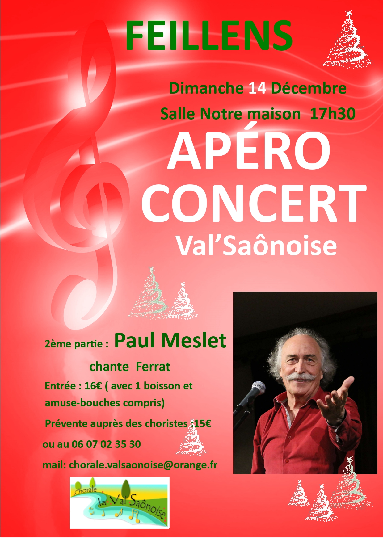 La commune de Feillens accueillera un apéro-concert de la Val’Saônoise le dimanche 14 décembre à 17h30, à la salle Notre Maison.