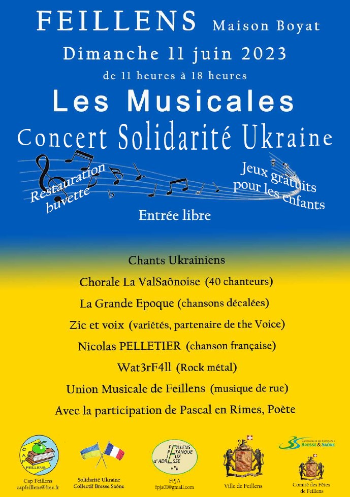 Une journée concert solidarité Ukraine est organisée à Feillens le dimanche 11 juin dont tous les bénéfices serviront à acheter des produits pour l’Ukraine.