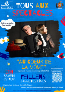 La bibliothèque de Feillens accueillera dans la salle des Dîmes un spectacle musical « Au coeur de la Môme » en hommage à Édith PIAF le samedi 22 novembre à 20h00.