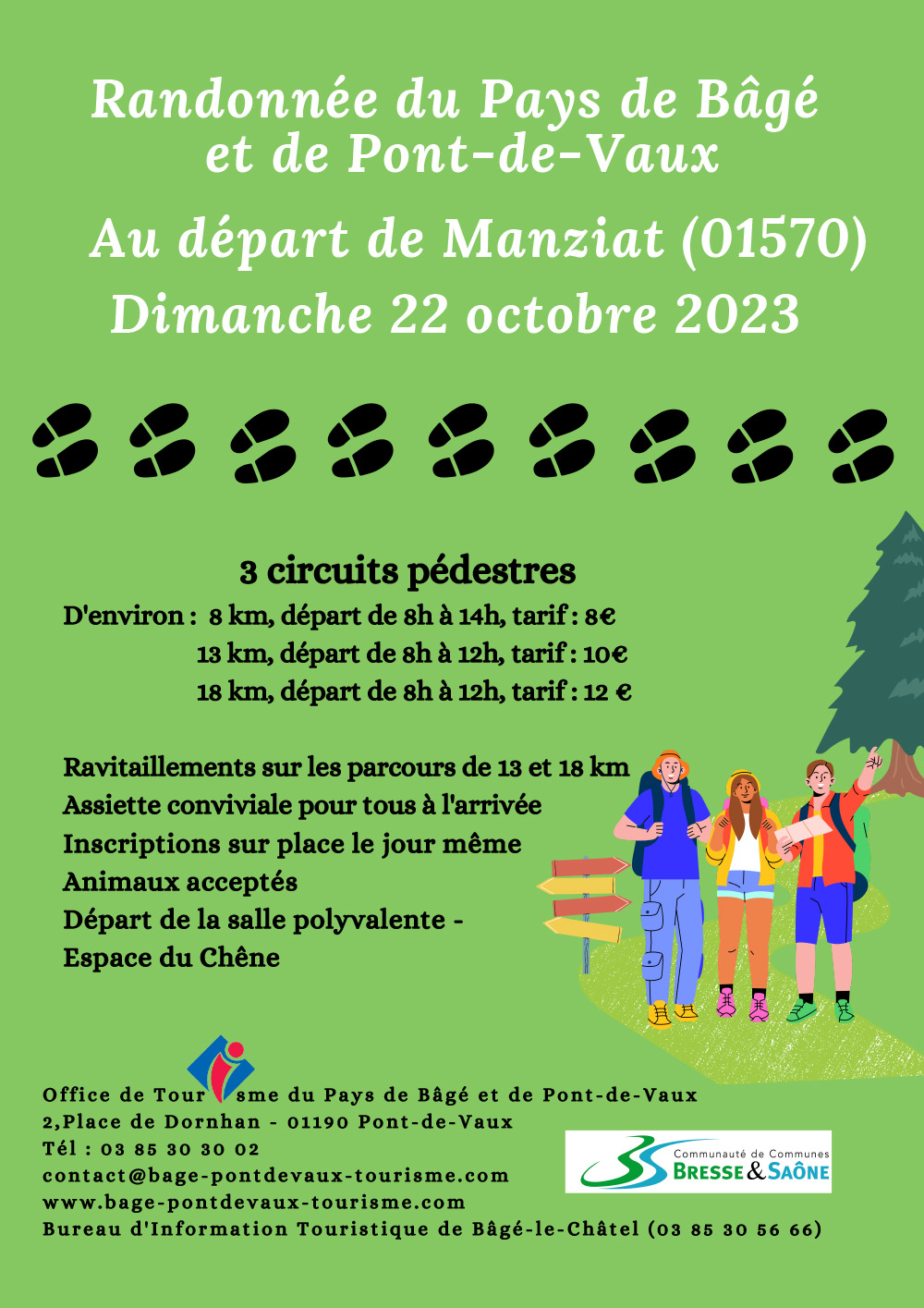 Accueil>Manziat | Randonnée du Pays de Bâgé et de Pont-de-Vaux Manziat | Randonnée du Pays de Bâgé et de Pont-de-Vaux 22 Oct 2023. L’Office de tourisme du Pays de Bâgé et de Pont-de-Vaux organise une randonnée pédestre à Manziat le dimanche 22 octobre ! Trois circuits différents avec des ravitaillements et des assiettes conviviales à l’arrivée pour profiter de votre dimanche. studioatypical peacefairapp apii spbo graduationtees jabalpurmanagementassociation Hautde page
