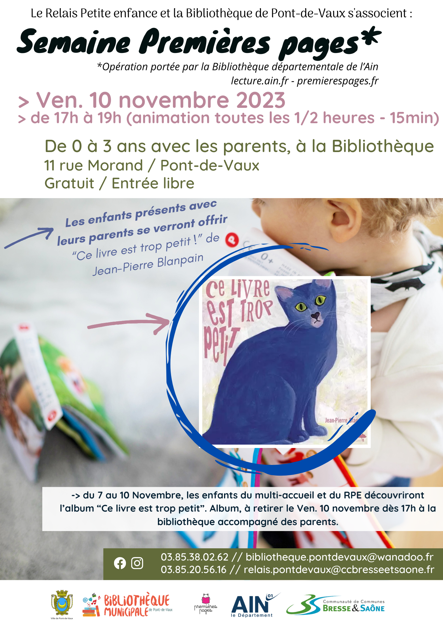 Le Relais Petite Enfance et la Bibliothèque municipale de Pont-de-Vaux s’associent et ont le plaisir de vous inviter pour la Semaine Premières Pages le vendredi 10 novembre 2023 de 17h à 19h autour de lectures et comptines adaptés aux tout-petits accompagnés de leurs parents.