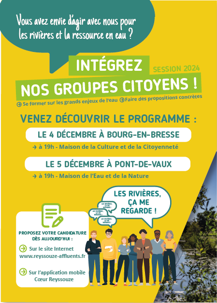 Reyssouze et Affluents, collectivité en charge de la gestion des milieux aquatiques et de la prévention des inondations, souhaite intégrer les citoyens dans son organisation : dans un contexte de changement climatique, la participation citoyenne est une réponse pour prévenir et anticiper les conflits d’usage à venir autour de la ressource en eau, et notamment autour des rivières.