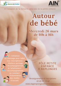 Les Relais Petite Enfance de la Communauté de communes organisent un événement « Autour de bébé » à l’occasion de la Semaine nationale de la petite enfance le mercredi 26 mars au Pôle Petite Enfance de Replonges.