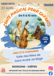 L’école de musique Orféo organise un conte musical « Niels et la Chamanoine » le mercredi 23 avril à 15 heures à la salle des fêtes de Saint-André-de-Bagé.