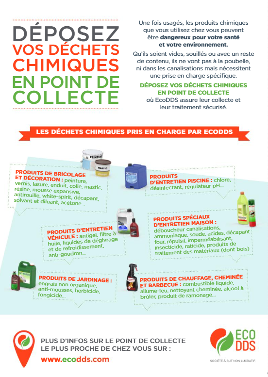 Des points de collecte EcoDDS sont à votre disposition dans vos déchetteries de Feillens et de Pont-de-Vaux pour déposer vos produits chimiques usagers.
