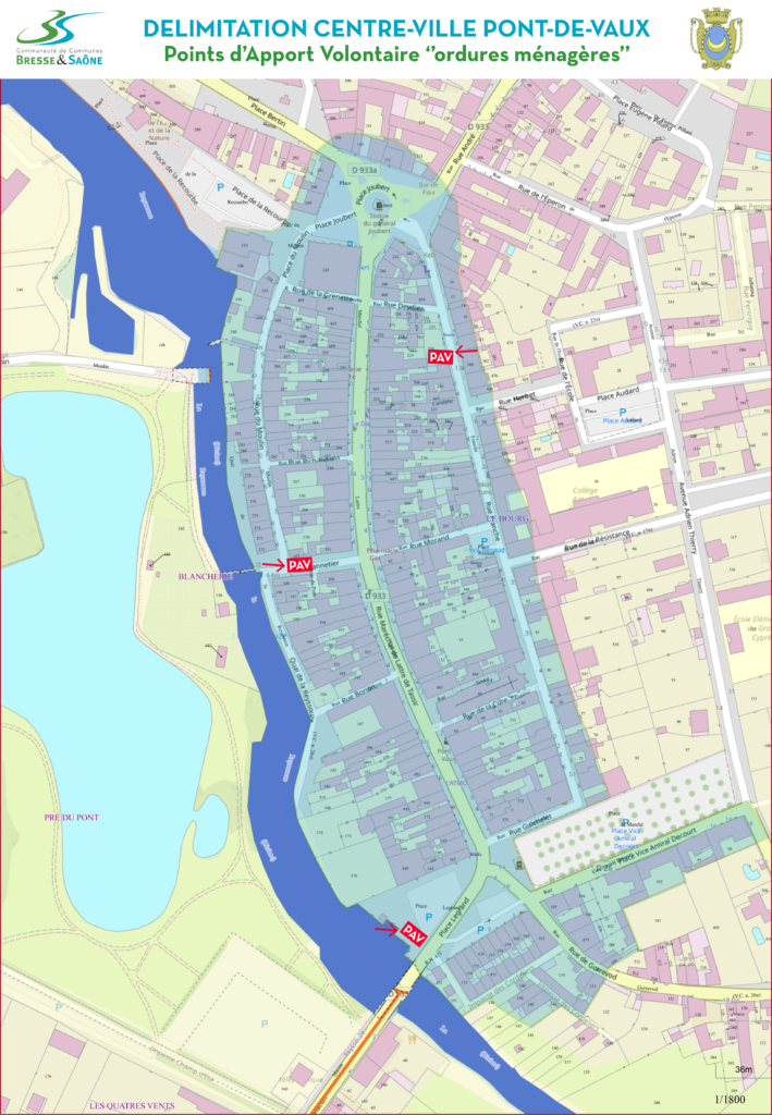La délimitation du centre-ville de Pont-de-Vaux (colonnes PAV pour ordures ménagères)