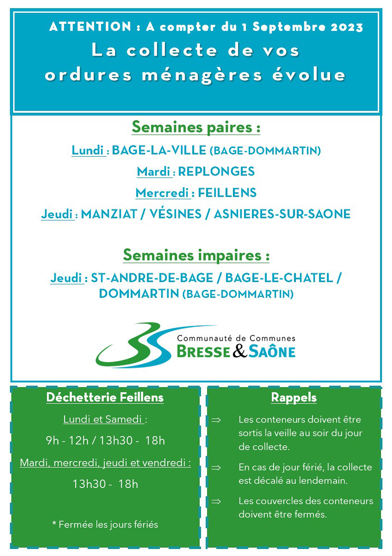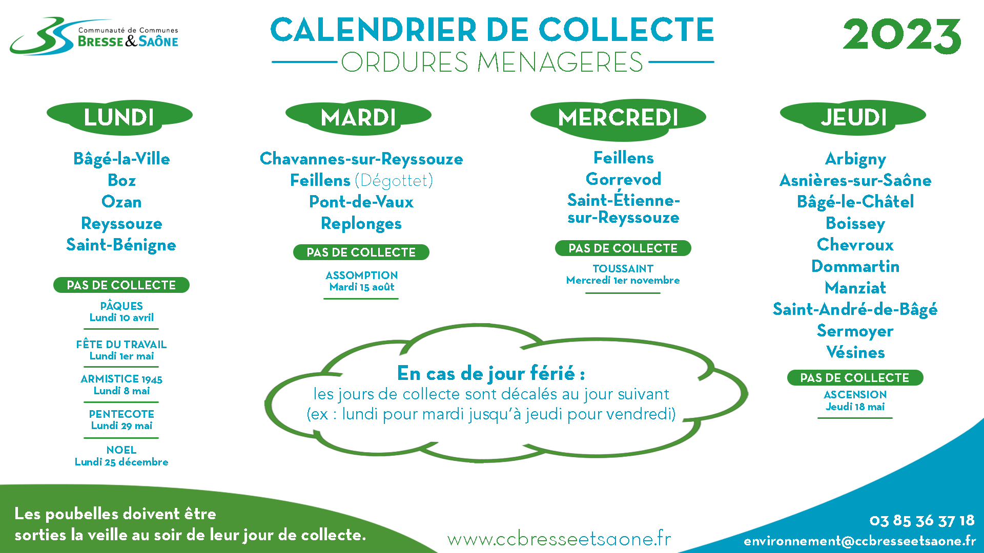 En cas de jour férié, les jours de collecte sont décalés au jour suivant (ex : lundi pour mardi jusqu’à jeudi pour vendredi).
