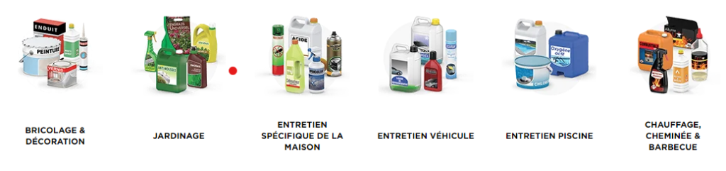 Des produits de bricolage (peintures, enduits, colles, mastics, solvants, acides…), d’entretien de véhicule (liquide de refroidissement) de jardinage (insecticides, biocides, phytosanitaires…), des comburants*… Découvrez, en détail, tous les produits chimiques usagés pris en charge par EcoDDS. Ils sont classés par famille d’usage afin de faciliter leur identification.