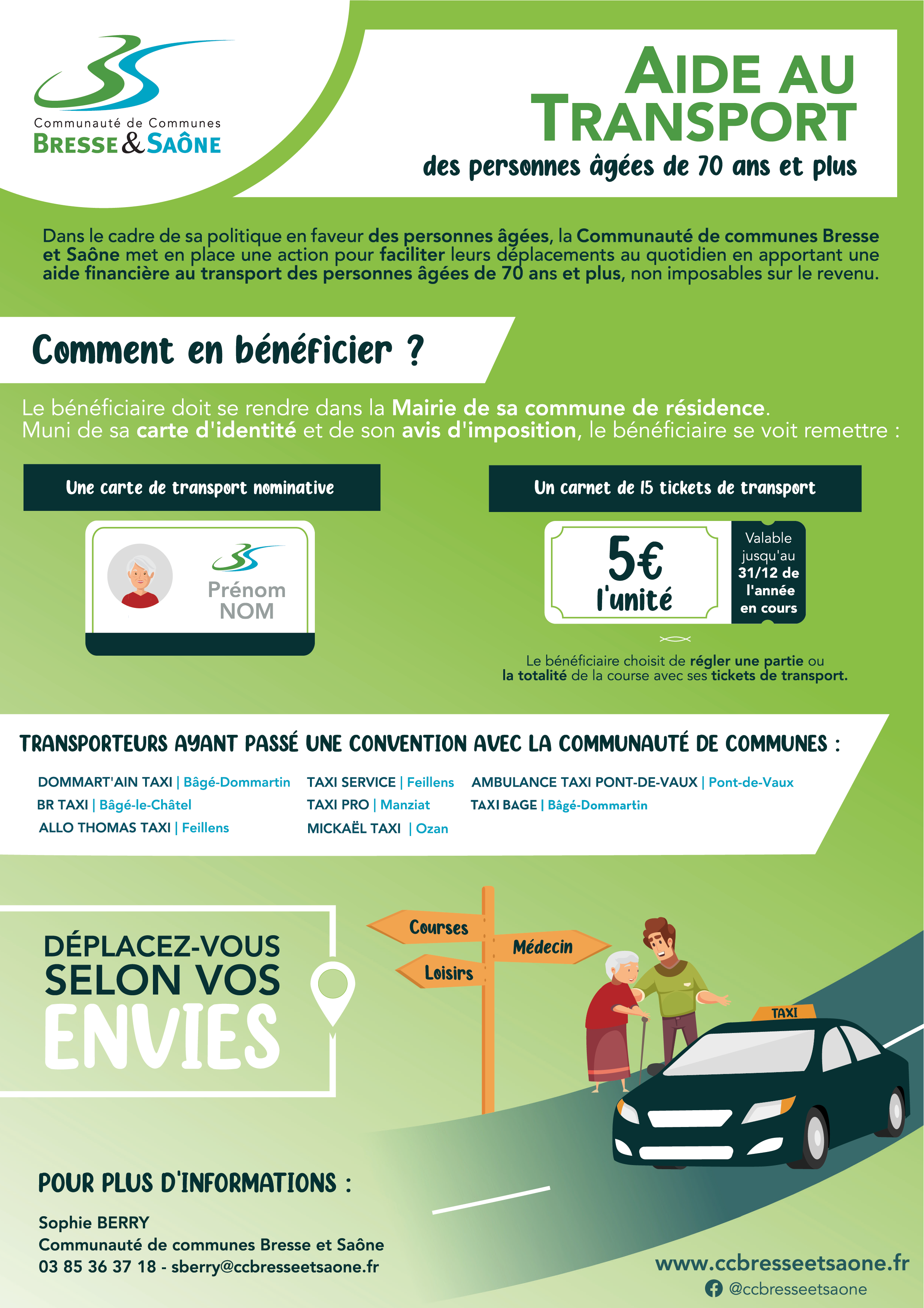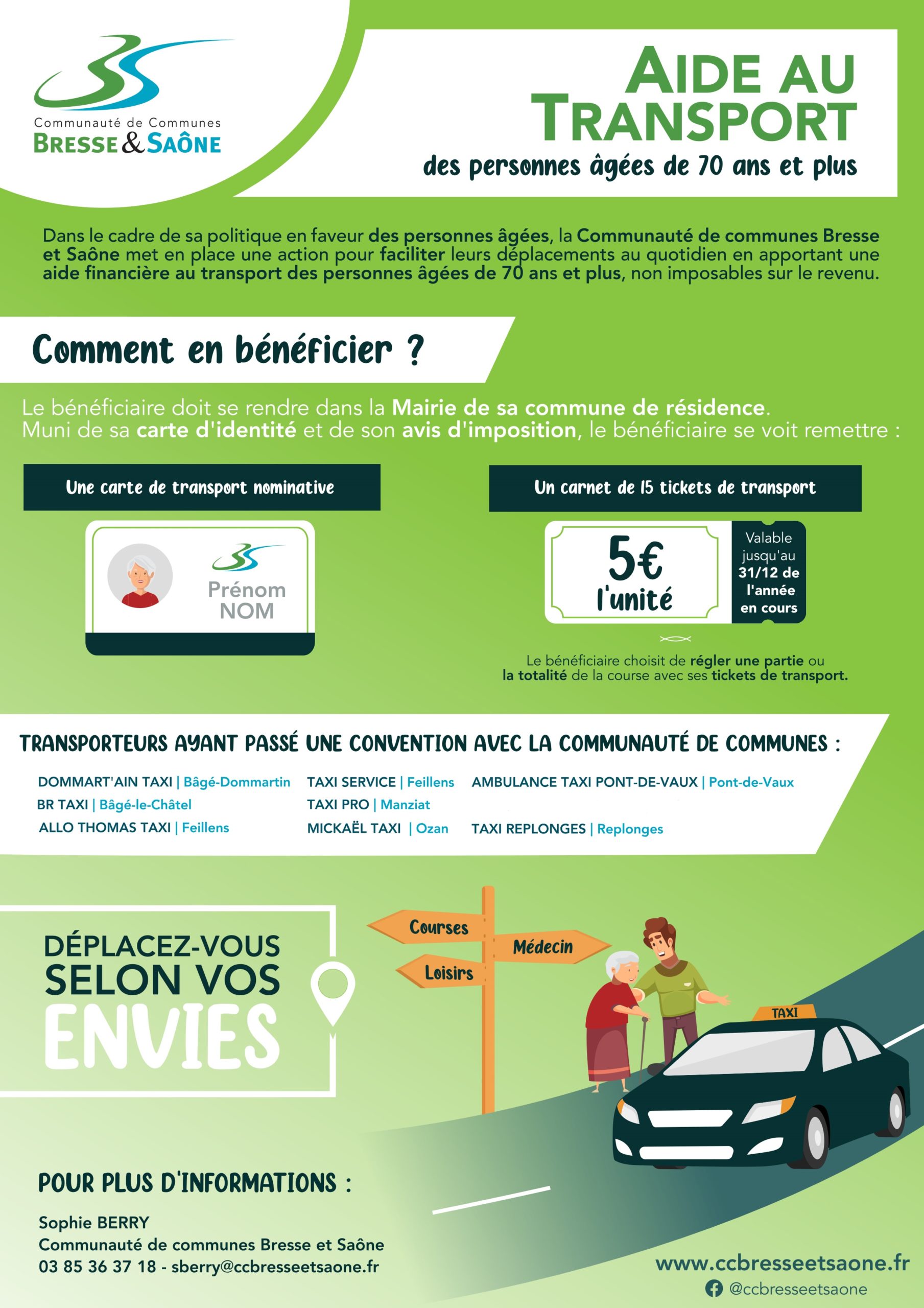 Dans le cadre de sa politique en faveur des personnes âgées, la Communauté de communes Bresse et Saône met en place une action pour faciliter leurs déplacements au quotidien en apportant une aide financière au transport des personnes âgées de 70 ans et plus, non imposables sur le revenu.