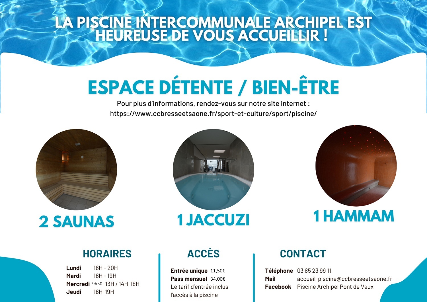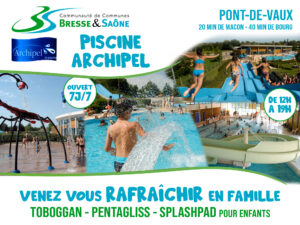 La piscine intercommunale Archipel est située à Pont-de-Vaux, dans l’Ain, à 15 minutes de Mâcon et à 20 minutes de Tournus. Elle est ouverte depuis l’année 2000 et c’est le lieu idéal pour profiter en famille, en solitaire ou entre amis de toutes nos installations, été comme hiver.