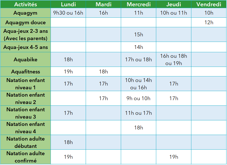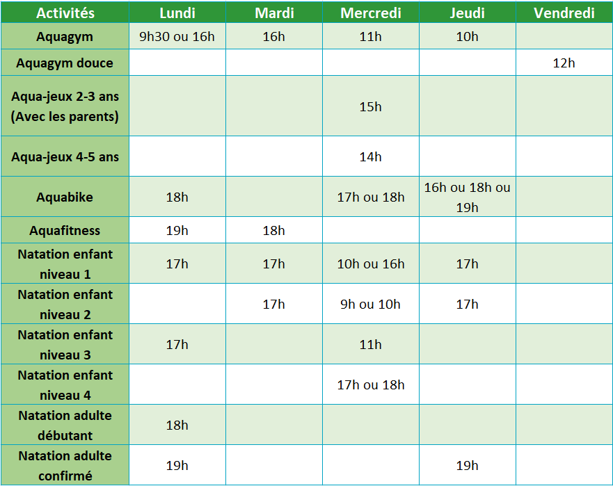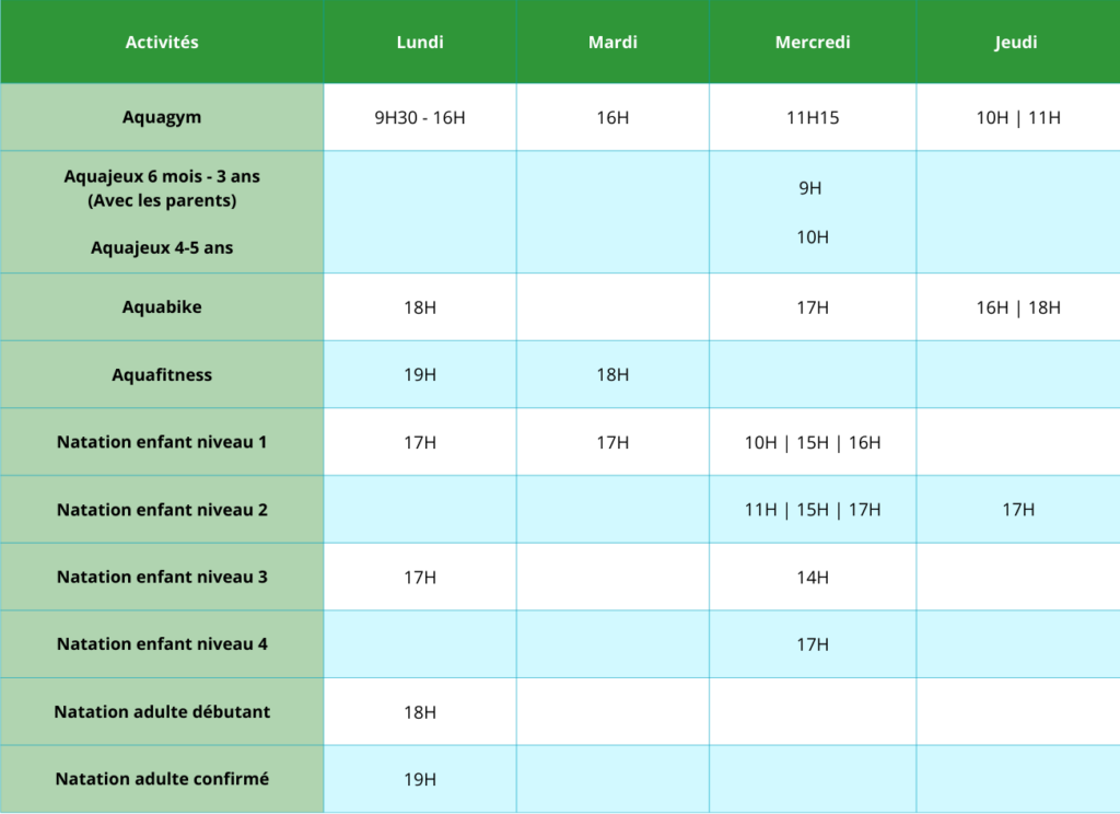 Les cours sont dispensés dans le bassin d’activités sauf la natation et l’aquagym du lundi matin dans le bassin de 25m.