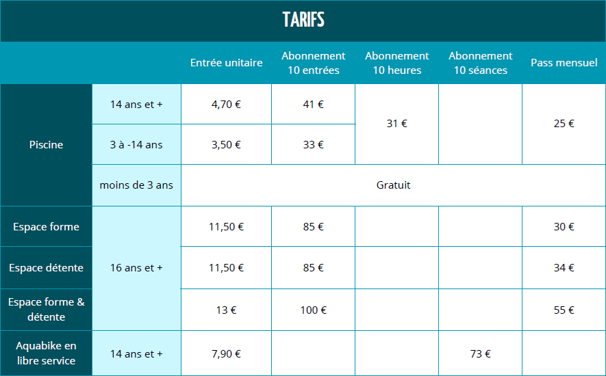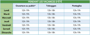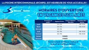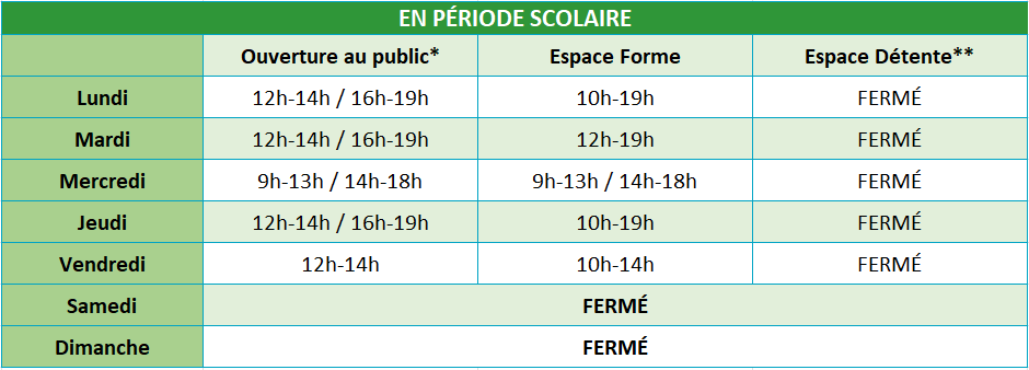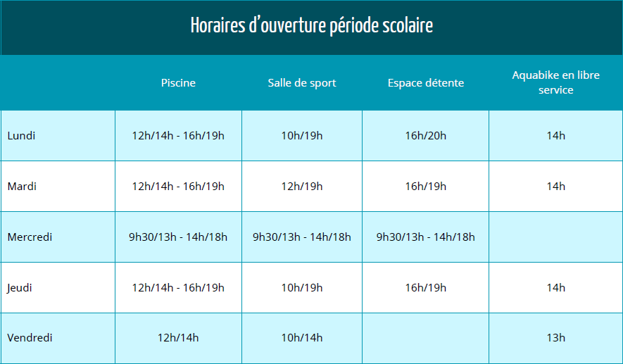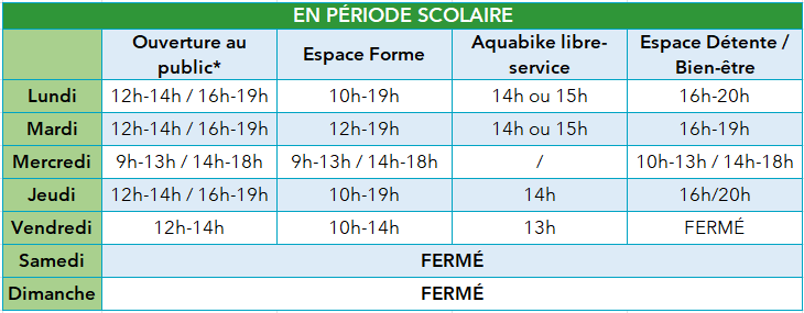 *Évacuation des bassins 15 minutes avant la fermeture – ces horaires sont donnés à titre indicatifs et susceptibles d’être modifiés en cas de nécessité.