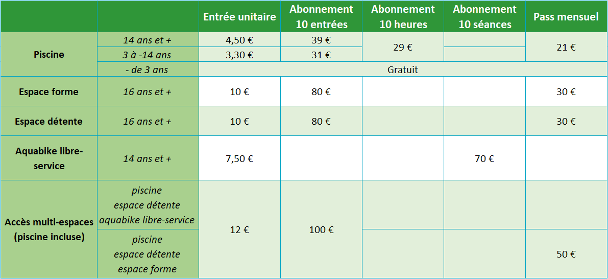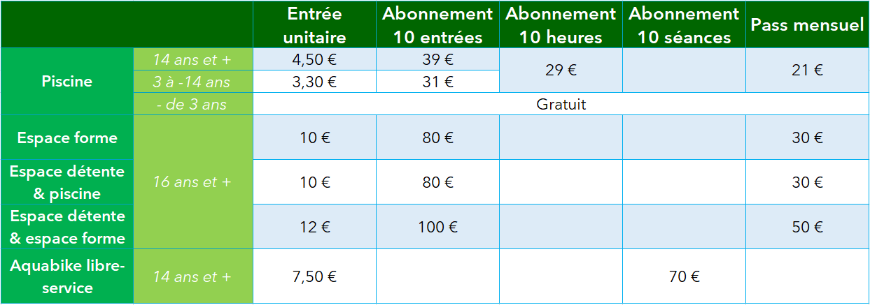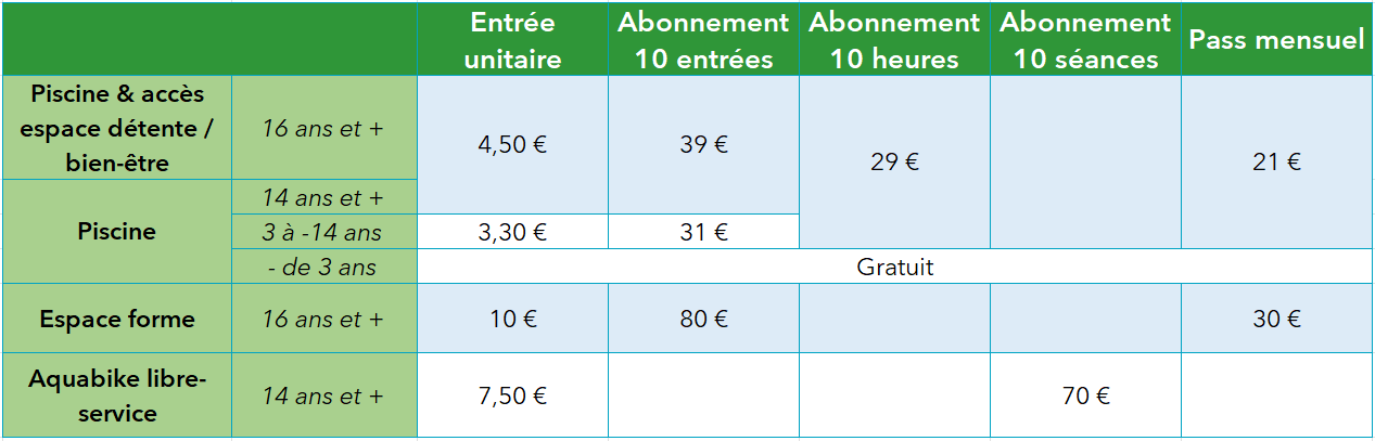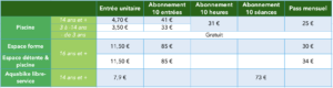 Tarifs de la piscine