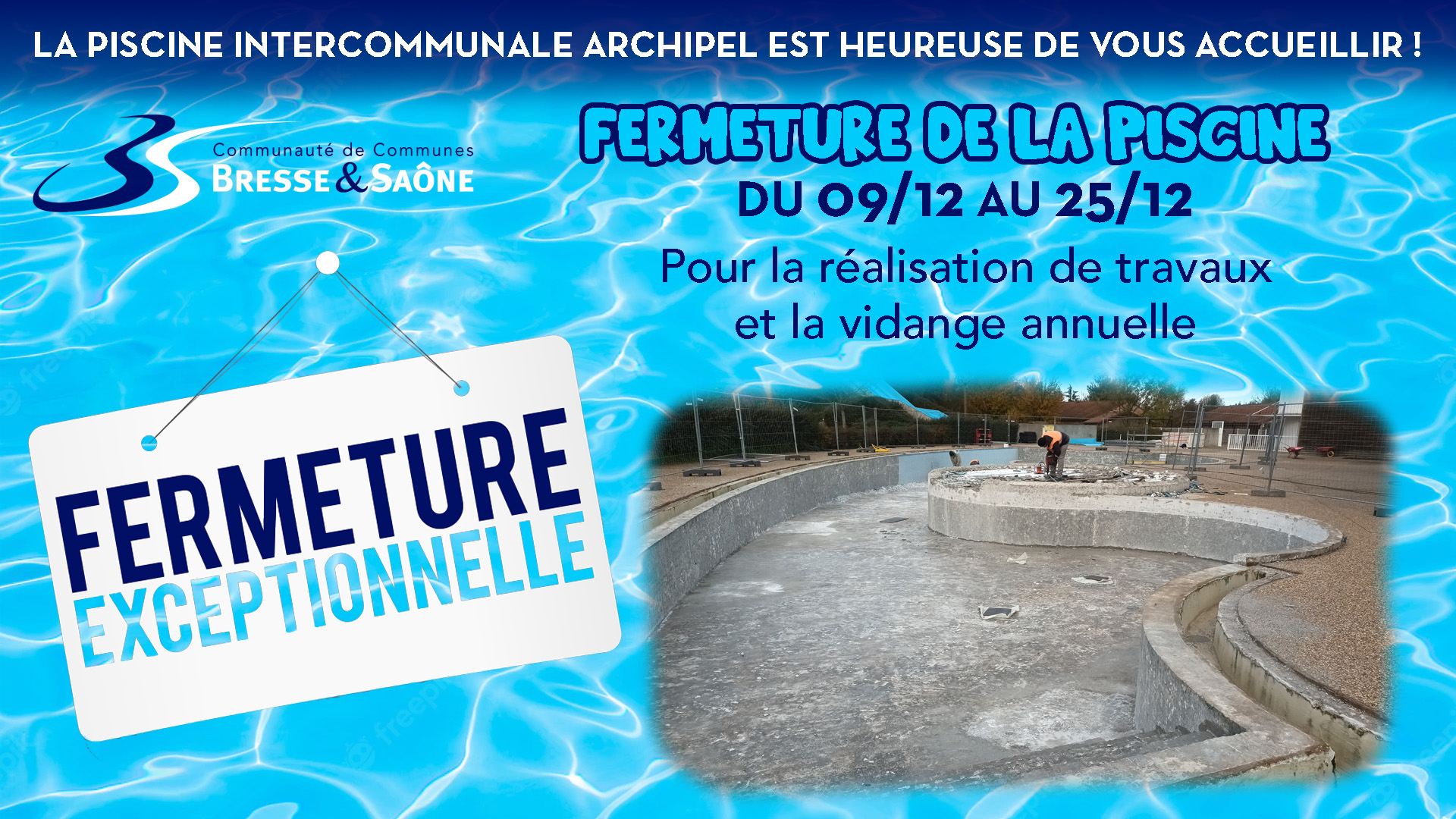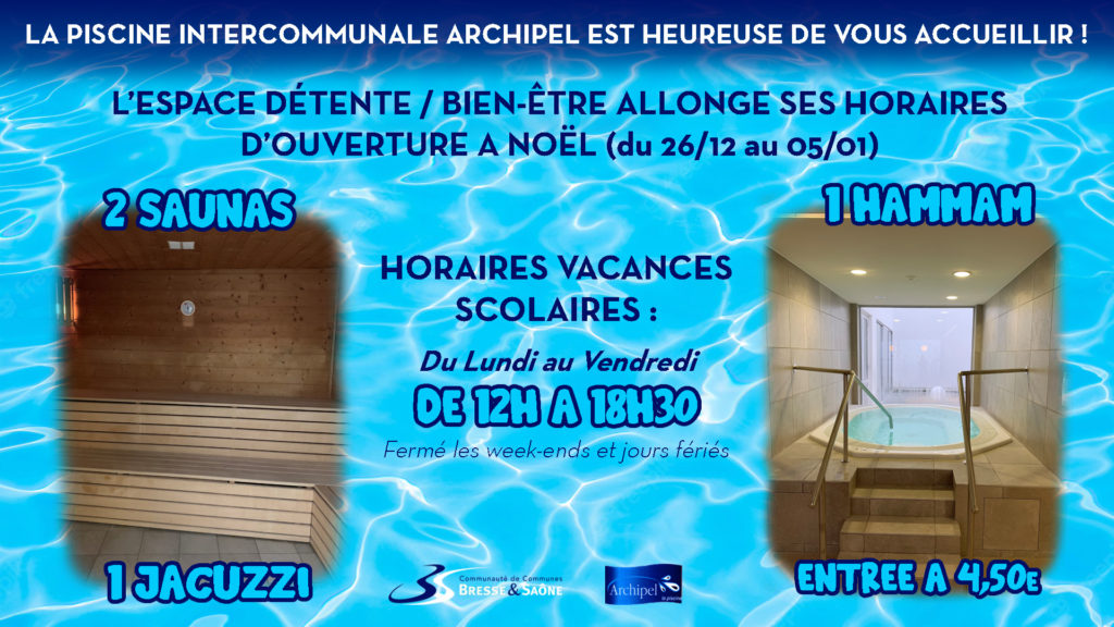 La piscine Archipel sera fermée du jeudi 25 décembre 2025 au dimanche 04 janvier 2026 inclus.